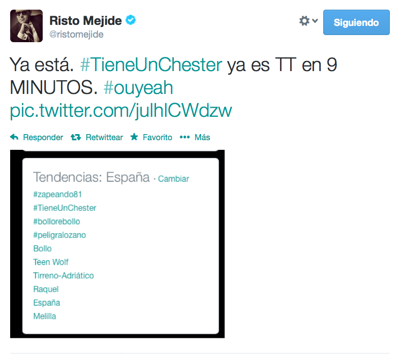 El hashtag que ha promovido para ello, #TieneUnChester, no ha tardado en convertirse en tendencia en Twitter, y el propio Mejide ha compartido algunas de las respuestas: Julio Anguita, Pablo Iglesias, Emilio Botín o Andrés Iniesta han sido propuestos.