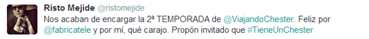 Risto Mejide puede acomodarse en su sofá. Cuatro ha renovado por una segunda temporada Viajando con Chester, tal y como su presentador ha confirmado a través de Twitter.